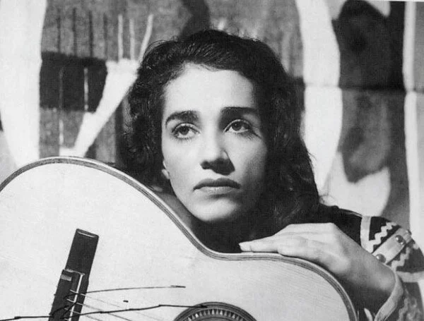 Portrait of Chavela Vargas and her guitar.